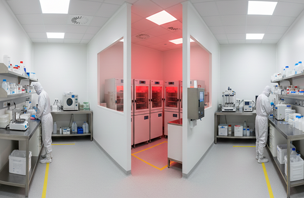 The microbiology laboratory is designed to perform accurate microbial testing, supporting the safety and reliability of pharmaceutical products.