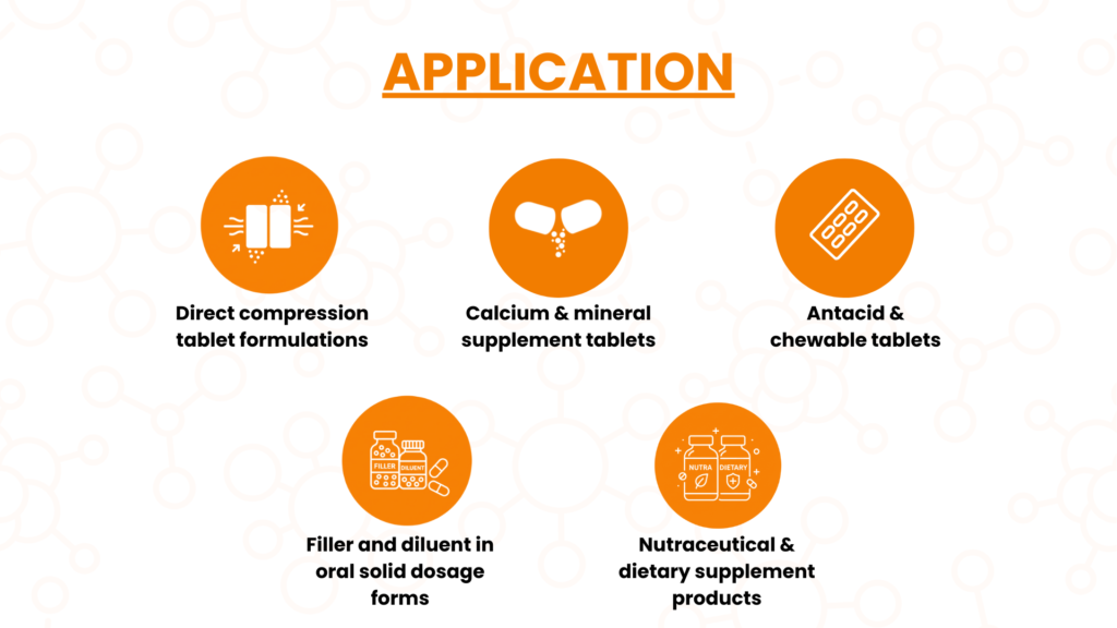 It is widely used in direct compression tablet formulations across pharmaceutical and nutraceutical applications. Common uses include antacid tablets, calcium and dietary supplements, and as a filler or diluent in oral solid dosage forms, where consistent quality and performance are essential.
